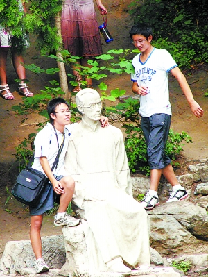 為了留下記憶,很多游客爭相和校園內的雕塑合影!鞍沧痹诤商烈唤堑摹爸熳郧逑壬狈浅J芮嗖A。有的游客和“老先生”勾肩搭背,更有甚者,直接坐在“老先生”腿上照相。