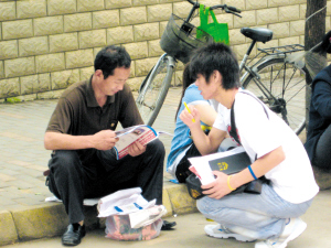 6月7日,高考的第一天。早上7點,當(dāng)記者來到蚌埠市懷遠(yuǎn)縣一中大門口時,發(fā)現(xiàn)這里除了正在等候考試的考生和家長,還有很多手里拿著大堆傳單和招生簡章的年輕人,并不斷地往家長和學(xué)生手里塞。