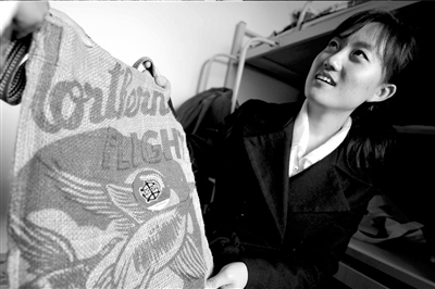 石嫣展示她從美國(guó)帶回的手工制環(huán)保袋。 記者 范繼文攝