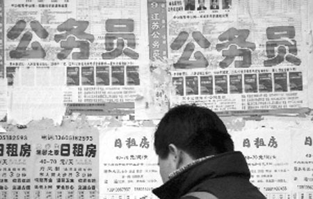 昨天,記者從南京幾所高校校內(nèi)信息公告欄里看到,公務員考試輔導班大有風頭蓋過考研輔導班的趨勢,連學生宿舍樓門口、餐廳門口公告欄上,也張貼著公務員考試輔導的招生海報。