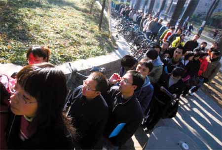 昨日(20日,下同)上午,清華大學(xué),求職學(xué)生在招聘現(xiàn)場(chǎng)門(mén)外排起長(zhǎng)隊(duì)。因人數(shù)較多,校方一度限制學(xué)生進(jìn)場(chǎng)。到11時(shí),隊(duì)伍超過(guò)兩百米。本報(bào)記者 薛珺 攝