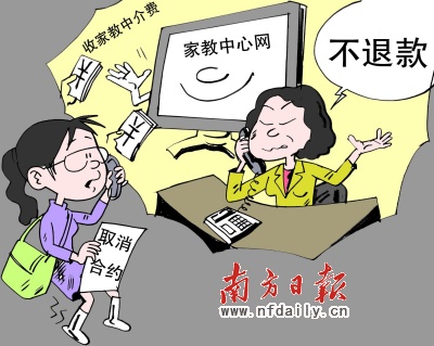 “家教中介費(fèi)怎么就易收難退?”日前,本報(bào)接到華南師范大學(xué)學(xué)生小東(化名)報(bào)料稱(chēng),在其交納中介費(fèi)后由于受教對(duì)象原因未能成功進(jìn)行家教,但家教中介公司卻以有關(guān)條款為由不予退款。