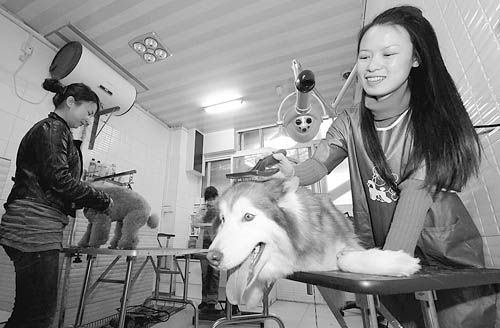 3月31日,寵物美容店店主徐曉娟(右)在為客人的寵物狗美容。2004年,貴州大學經(jīng)濟貿(mào)易系的徐曉娟大學畢業(yè)后選擇自主創(chuàng)業(yè)。她在貴陽市開辦了一家名為“千寵萬愛”的專業(yè)寵物美容店,由于服務專業(yè)、管理得當,生意一直不錯,月收入近萬元。她的寵物美容店也成為大中專畢業(yè)生的實習場所,先后有20多位畢業(yè)生來此打工或?qū)W習。