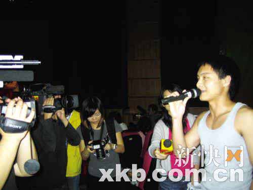 可惜,千呼萬喚之下“提問者”仍不肯露面。突然,一名欲發(fā)言的“局外”男生把手舉得老高,他還沒來得及發(fā)言,已被攝像搶、閃光燈“重重包圍”。