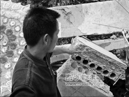 熊永豪認(rèn)為,除了設(shè)計上的先天不足,教學(xué)樓在后期施工中,也存在不少隱患。站在廢墟上,他隨手撿起一塊磚頭,上面光滑平整,幾乎沒有粘著水泥!斑@表明兩個問題,可能是水泥的標(biāo)號不夠,或者是涂在磚上沙灰飽和度不夠!毙苡篮勒f。