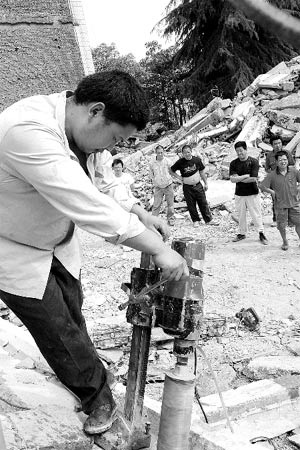家長(zhǎng)們很不理解,大聲質(zhì)問:“為什么不透露單位名稱?我們?cè)鯓拥玫綑z測(cè)結(jié)果?”“我們是四川禾力建設(shè)工程質(zhì)量檢測(cè)有限公司的!惫ぷ魅藛T忙說。該公司另一組取樣人員,正在對(duì)綿竹市幾所學(xué)校的建筑廢墟進(jìn)行取樣。隨著機(jī)器的轉(zhuǎn)動(dòng),一個(gè)個(gè)標(biāo)本從大梁中取出,他們?cè)跇颖旧蠘?biāo)注上日期和地址等信息。