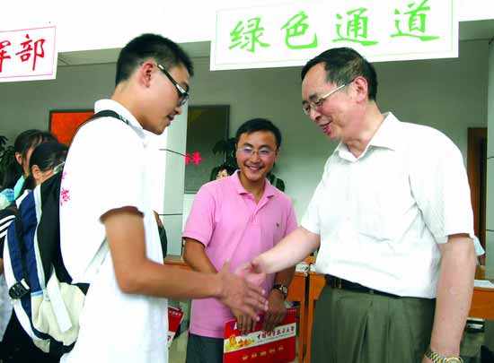 正在王德鑫和王剛填寫表格的過程中,中科大校長朱清時院士來到了他們身邊,“歡迎你們來到中科大!”校長向他們伸出了溫暖的大手。聽說王德鑫和王剛早早就立志考科大,朱校長高興地說,“我也是四川人,也是早早立志考科大,我是1963年考上的,到現(xiàn)在45年了!痹诹私獾酵醯脉问且粋人來報到時,朱校長連聲夸贊他“了不起”,“現(xiàn)在一個人來報到的學生可不多了,當年,我們都是一個人來學校的!”在向兩位同學簡單介紹了“綠色通道”的報名程序后,校長再次祝福他們:“祝愿你們在中科大的生活和學習一切順利!”