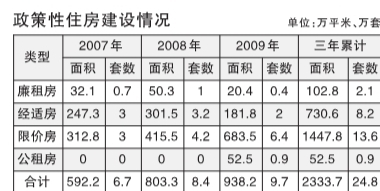 在住房保障方面,自2007年至2009年,本市已累計建設了24.8萬套政策性住房。其中限價房套數最多,達到13.6萬套。