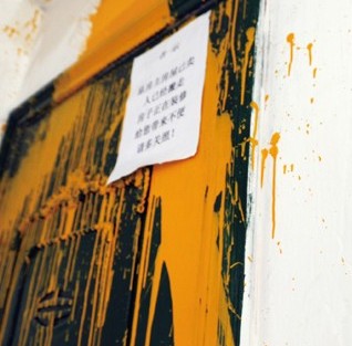 郭先生說,今年7月份他在浮山后一小區(qū)5號(hào)樓買了一套房子,價(jià)格不菲,一萬多一平方米,前些日子,他找來裝修工人對(duì)房子進(jìn)行裝修,準(zhǔn)備盡早住進(jìn)去。因?yàn)槠匠0滋煲习,房子就交給工人處理,偶爾過去看一下。前天一早,郭先生突然接到裝修工人的電話,說房子大門和墻壁被人破了油漆,讓他趕緊來看看。黃先生立即趕過去,看到大門和樓道里滿是黃色的油漆,甚是刺眼,弄得鄰居們也跟著受驚嚇。
