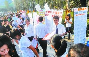 記者看到,不少置業(yè)顧問(wèn)為了在場(chǎng)外截留客戶(hù),干脆在場(chǎng)外擺下戰(zhàn)場(chǎng)。他們有的將房源做成小的展板,舉在頭上,有的將房源寫(xiě)成大字報(bào)擺地上,在會(huì)展中心場(chǎng)外形成了一個(gè)場(chǎng)外房交會(huì)。