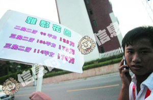 “賣樓、賣樓、105平方200萬!鼻疤煜挛5點,記者在海珠區(qū)濱江東路上目睹了一隊舉著木牌的地產(chǎn)中介在路上兜售叫賣二手樓。這種景象近日在廣州多處可見,由于加息、限購令對樓市的雙重影響,二手樓中介市場也遇到瓶頸,不少中介行已經(jīng)使出比應(yīng)對2008金融海嘯時更強的促銷招數(shù)。 看樓客普降三成 根據(jù)滿堂紅的統(tǒng)計數(shù)據(jù)顯示,自從加強版新政出臺后,廣州各區(qū)二手房的看樓客普遍減少了30%左右。記者了解到,不但看樓客減少了,一些原先有意賣房換大屋的業(yè)主也變得謹(jǐn)慎起來了。 “我們現(xiàn)在每天都要出來巡街!痹跒I江東路上,一位舉牌的合富中介小黃告訴記者。不僅僅是這家中介公司,附近的多家中介近日都自制了巡街用的木牌,這種木牌類似于運動會開幕式運動員進(jìn)場的引導(dǎo)牌,牌子上貼著花花綠綠的紙張,寫著各類“筍盤信息”。一邊巡街,一些中介口中還念念有詞,大聲叫賣。路過的街坊無不覺得好玩,住在附近的石小姐說,“見過在路上叫賣包子的,還沒見過叫賣房子的”。