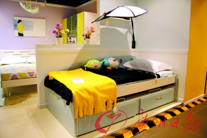 記者看到很多類(lèi)似組合:高架床,床旁邊是一個(gè)小扶梯,扶梯臺(tái)階由幾個(gè)抽屜拼成,抽屜可以?xún)?chǔ)放衣物。床下面是一個(gè)轉(zhuǎn)角電腦學(xué)習(xí)桌,可以放置一臺(tái)電腦,又可以當(dāng)書(shū)桌使用。在電腦桌旁還放有一個(gè)小衣柜,可以放置一些常用衣物。另一轉(zhuǎn)角處有一個(gè)文件柜,可以放學(xué)習(xí)資料和書(shū)籍。電腦桌被分隔成二層,底下的一層還可以放小物件、書(shū)籍等。大約兩平方米的空間就這樣被充分利用起來(lái)了。