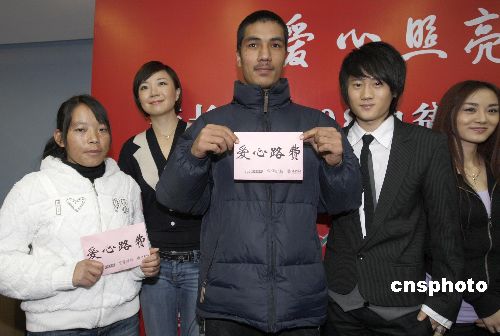 1月2日,臧天朔、葉蓓、江一燕等藝人在北京為不能回家過年的貧困大學(xué)生資助回家的路費(fèi)。中國扶貧基金會(huì)“新長(zhǎng)城”項(xiàng)目發(fā)起“愛心照亮回家路——資助貧寒學(xué)子回家過年”慈善活動(dòng),臧天朔等眾多藝人出席活動(dòng)并現(xiàn)場(chǎng)捐款。此次活動(dòng)將幫北京地區(qū)的眾多貧困大學(xué)學(xué)子得到回家過年的路費(fèi),讓他們能夠回家與家人團(tuán)聚。中新社發(fā) 杜洋 攝