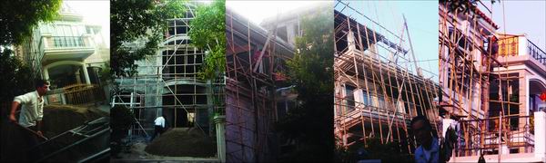 來(lái)到小區(qū)內(nèi)雅濤二街,一座原兩層半的別墅四周全是腳手架,樓下堆滿水泥沙石。不斷有泥頭車轟隆轟隆地開過(guò)來(lái),將一堆水泥傾倒地上,空氣中滿是灰塵。房屋的大門已經(jīng)撤下,幾個(gè)滿頭大汗的工人站在腳手架上忙碌,幾個(gè)月的工夫,他們將房屋砌到了5層樓高。