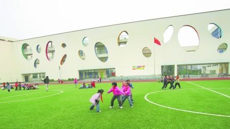 昨日下午,記者來到草堂小學(xué)翠微校區(qū),4棟通過走廊連為一體的4~5層的建筑格外引人注目。正對學(xué)校大門的墻體,鑲著10多個彩色的橢圓。設(shè)計者、西南交通大學(xué)教授王蔚介紹說,翠微校區(qū)占地20余畝,建筑面積一萬余平方米,而總投資僅2000多萬元。“這些彩色的橢圓圖案,代表著水滴。陽光下,‘水滴’呈現(xiàn)出不同顏色,這代表了學(xué)生們的不同個性。校舍以‘陽光下的水滴’為設(shè)計構(gòu)思,充分表達了在我國素質(zhì)教育的原則下,尊重個性發(fā)展,尊重少年兒童人格特征的理念!