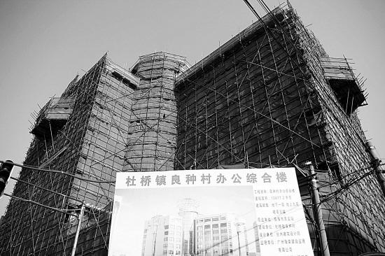 說(shuō)它是熱帖,準(zhǔn)確地說(shuō)其實(shí)就是一組照片。照片中,一幢大樓拔地而起,主體框架已搭建完畢,不過(guò)由于尚未完工,整幢大樓像是穿上了一層漁網(wǎng)服。大樓底下立著一塊規(guī)劃牌,最上面寫著“杜橋鎮(zhèn)良種村辦公綜合樓”,中間是大樓的效果圖,9層高的大樓看上去頗為壯觀。