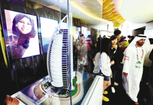 沿著時(shí)光隧道般的過道,古老的阿聯(lián)酋慢慢展現(xiàn)在參觀者眼前。阿聯(lián)酋的大學(xué)生志愿者們穿著傳統(tǒng)的服飾向游人問好,仿佛來自遠(yuǎn)古的駝鈴聲回蕩在耳邊。移步換景,在現(xiàn)代館內(nèi),參觀者恍如換了個(gè)世界,看到的是利用視聽技術(shù)營造的現(xiàn)代阿聯(lián)酋,它有著快速發(fā)展的城市環(huán)境,有讓世界矚目的建筑和風(fēng)景,還有豐富多彩的時(shí)尚文化。