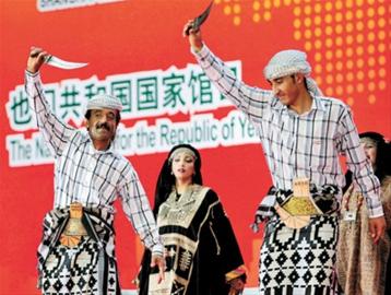 也門位于阿拉伯半島西南端。也門館館內(nèi)設計仿照薩那老城 “銅器市場”的樣貌,并在背景上采用薩那老城古老塔樓的照片。(張駿)