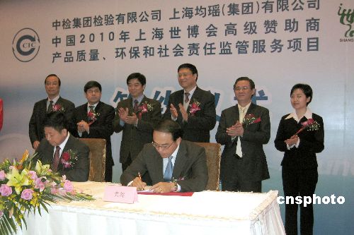 一月十八日,效法北京奧運模式,中國檢驗認(rèn)證集團(tuán)有限公司在上海與中國二0一0年上海世博會特許產(chǎn)品生產(chǎn)高級贊助商簽署世博特許產(chǎn)品質(zhì)量、環(huán)保監(jiān)管服務(wù)項目協(xié)議。圖為世博會高級贊助商之一的上海均瑤(集團(tuán))有限公司與中檢集團(tuán)簽約。結(jié)合北京奧運會特許產(chǎn)品質(zhì)量監(jiān)控經(jīng)驗,未來中檢集團(tuán)將對上海世博會各大類特許產(chǎn)品實行原料、生產(chǎn)、加工、管理、包裝及銷售的全流程質(zhì)量控制,包括對上海世博會吉祥物“海寶”衍生產(chǎn)品的質(zhì)量監(jiān)控。中新社發(fā) 許曉青 攝