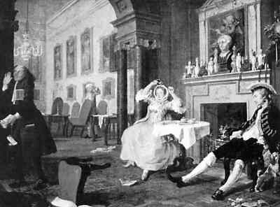首先惹禍的是幾幅油畫作品。英國畫家威廉·霍加斯的著名作品《時髦的婚姻》在當時被展出,這組畫共有6幅:訂婚、時髦婚姻、求醫(yī)、音樂會、決斗、自殺。正是這一組帶有強烈批判意義的畫引發(fā)了上流社會的不滿和爭議,紅衣大主教更是大發(fā)雷霆,下令禁士教士、學校校長和家長前去參觀,這件事在當時也鬧得沸沸揚揚。