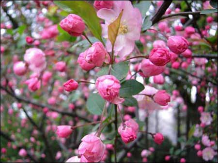 海棠:海棠花姿瀟灑,雅俗共賞,素有“花中神仙”“花貴妃”之稱。明代《群芳譜》記載,海棠有四品,指的是西府海棠、垂絲海棠、木瓜海棠和貼梗海棠。植物園內(nèi)這幾種海棠都有種植,目前已大量開放,有粉紅、鮮紅、粉白等多種花色。