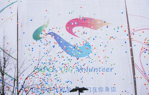 儀式上,中共中央政治局委員、中共上海市委書記、上海市世博會籌辦工作領(lǐng)導(dǎo)小組組長俞正聲揭曉了上海世博會志愿者標志,同時懸掛在新世界商廈外墻的巨幅樓體公益廣告隨之揭曉。中國2010年上海世博會志愿者標志的主體由漢字“心”、英文字母“V”、嘴銜橄欖枝飛翔的和平鴿構(gòu)成。與世博會會徽“世”異曲同工,在呈現(xiàn)中國文化個性的同時,表達了志愿者的用“心”和熱“心”!癡”是英文“Volunteer”的首字母,闡述了標志所代表的群體,賦予其清晰的含義;飛翔的和平鴿代表上海,也象征和平友愛,橄欖枝則寓意可持續(xù)發(fā)展和希望,傳承“城市,讓生活更美好”的世博會主題。彩虹般的色彩,迎風(fēng)飄舞的彩帶,是上海熱情的召喚。我們相信,2010年,在志愿者的努力下,來自世界各地的人將融洽地聚集在同一片天空下!