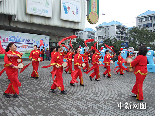 在長青路、成山路口的華聯(lián)吉買盛廣場(chǎng)四周,23個(gè)2米高1米寬笑容可掬的海寶圍著一圈,不斷地向前來參加活動(dòng)的志愿者招手致意。一旁,喜慶的龍車上,鑼鼓敲得震天響。廣場(chǎng)中央,來自居民區(qū)的志愿者代表和來自社區(qū)學(xué)校的紅領(lǐng)巾代表集結(jié)在一起,他們將迎接海寶到小區(qū)。