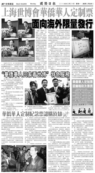 中新網(wǎng)4月8日電 《國(guó)際日?qǐng)?bào)》3月30日刊登世博專版,介紹上海世博會(huì)華僑華人定制紀(jì)念票。