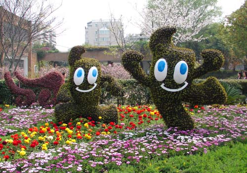 今年的上;ㄕ股俨涣烁魃ɑ艿臓(zhēng)奇斗艷,而“世博”的主題讓它們更顯與眾不同。世博主題演繹區(qū)、世博花卉品種區(qū)、世博街景示范區(qū)都讓游客駐足;“中國(guó)館”在郁金香的襯托下顯得端莊宏偉,游客們紛紛拿出相機(jī)忙著與植物擺出的“海寶”合影;“小志”和它的家人則受到了孩子們的追捧。