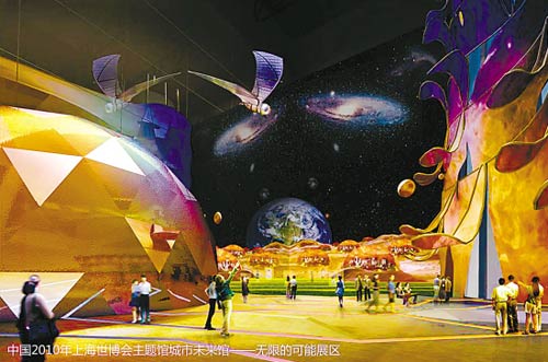 城市未來館的設(shè)計(jì)師重點(diǎn)推薦“未來就在這里”和“無限的可能”兩個(gè)展區(qū)!拔磥砭驮谶@里”展區(qū)是一個(gè)動(dòng)態(tài)城市模型的舞臺(tái)!盁o限的可能”將在“和諧廣場(chǎng)”上,放映暢想未來城市的各種可能性的動(dòng)畫電影。