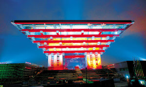 何鏡堂:我們主要從三方面著手。一是“中國(guó)印象”,主要是從繪畫、戲劇、文字、顏色等藝術(shù)形式中捕捉中國(guó)形象,中國(guó)館的整體就選用了極具中國(guó)特色的“中國(guó)紅”;二是“出土文物”,如從斗冠、寶鼎等器皿中汲取靈感,中國(guó)館分國(guó)家館和地區(qū)館兩部分,其中國(guó)家館的造型,就是通過(guò)對(duì)斗拱這一傳統(tǒng)建筑構(gòu)件進(jìn)行挖掘與提煉后設(shè)計(jì)出的;三是“城市園林”,從中國(guó)的城市建筑、園林中吸收營(yíng)養(yǎng),例如九宮格、南北軸線等,形成經(jīng)緯分明的建筑布局。