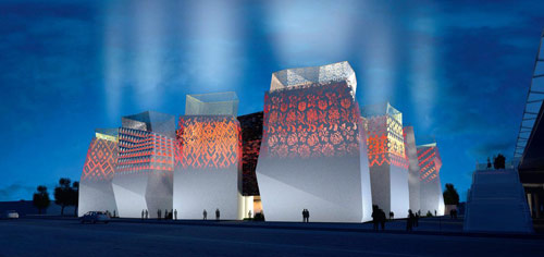 以“新俄羅斯:城市與人”為主題的俄羅斯館由12個塔樓和“懸浮在空中”的立方體組成,外形設(shè)計類似古代斯拉夫人的小村落,象征著生命之花、太陽以及世界樹(斯拉夫人枝葉繁茂的橡樹)的根。塔樓由白、金、紅三種顏色構(gòu)成,白色和金色塑造了俄羅斯建筑的歷史形象,而紅色底色加上富有俄羅斯各民族元素的圖案,則賦予了塔樓頂部鏤空部分以生命力。