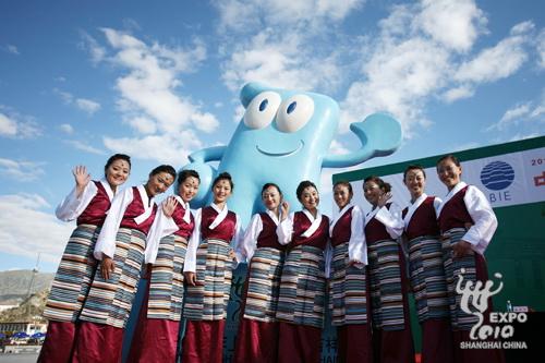 在雄偉壯觀的布達(dá)拉宮前,上海世博會的使者“海寶”張開笑臉,歡迎來自四方的游客,開幕活動儀式結(jié)束后,廣場上的民眾爭相與“海寶”留影紀(jì)念,他們紛紛表示希望2010年去上海看世博會。