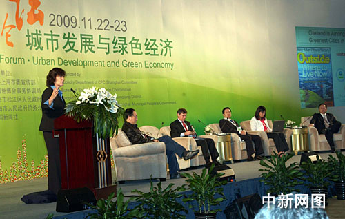 11月22日,世博論壇——城市發(fā)展與綠色經(jīng)濟(jì)在上海松江開幕。在當(dāng)天下午的專題論壇上,美國奧克蘭市市議會(huì)議長(zhǎng)簡(jiǎn)·布萊尼、美國圣安東尼奧市綠色工作委員會(huì)主席萊瑞·金、中國信陽市市長(zhǎng)郭瑞民、美國庫比蒂諾市副市長(zhǎng)胡宜蘭、中國洛陽市市長(zhǎng)郭洪昌等中外城市管理者同臺(tái)熱議“綠色經(jīng)濟(jì)”。張亨偉 攝