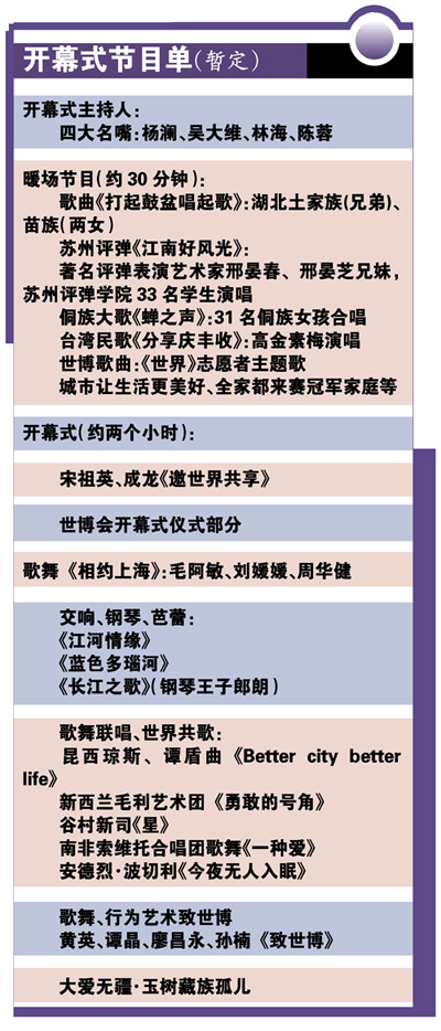 作為全世界人民的世博會,上海世博會開幕式將是中華風情和世界潮流的融合,“節(jié)目很精彩,大牌很多!眳⒓恿耸啦╅_幕式彩排的邢女士告訴記者。正式演出時,首先登場的是宋祖英和成龍,一曲《邀世界共享》,向全世界人民發(fā)出邀請。在歌聲中,56個民族身穿華服,還夾雜著雜技、飛天、長城等中國專屬符號,非常具有民族特色。隨后出場的毛阿敏、周華健、劉媛媛,用一曲《相約上海》,代表了上海向世界發(fā)出世博的邀請。