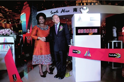 南非世界杯將于6月11日開幕,這是世界最高級別的足球盛會首次踏足非洲大陸。世博會南非館開館儀式上,李肇星與南非國際關系與合作部長馬沙巴內共同摁下了南非世界杯的倒計時牌!笆澜绫陂g,世博會南非館將不間斷播放世界杯比賽,歡迎大家來看!”馬沙巴內向參觀者發(fā)出了邀請。