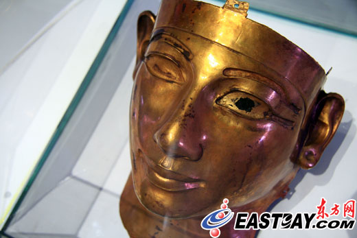 據(jù)介紹,“法老舍松契二世面具”誕生于公元前890年,在東尼羅河三角洲地帶被發(fā)現(xiàn)。黃金面具的左眼有一塊黑色,類似于眼珠,工作人員告訴東方網(wǎng)記者,可能是彩色涂料的殘留物,“這個(gè)面具的眼睛、眉毛等處在當(dāng)時(shí)應(yīng)該有被涂上彩色顏料!