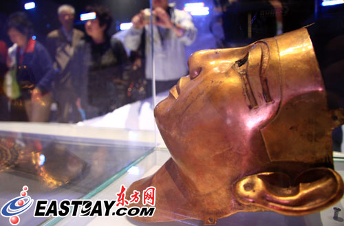 姍姍來(lái)遲的黃金制“法老舍松契二世面具”今天終于在世博會(huì)埃及館亮相。作為“鎮(zhèn)館之寶”的黃金法老面具被擺放在展館的最中央,吸引了大批游客駐足欣賞。
