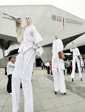 素來以穩(wěn)重、嚴(yán)謹(jǐn)著稱的德國人把一座“懸浮在空中的建筑”帶到了上海世博園區(qū),但當(dāng)看上去不穩(wěn)的德國館建筑單體構(gòu)成一個(gè)平穩(wěn)的整體時(shí),卻強(qiáng)烈地表現(xiàn)出“和諧都市”的主題。今天上午,德國館迎來國家館日。德國館日的活動(dòng)精彩紛呈。中午時(shí)分,在世博軸陽光谷,歐洲青年交響樂團(tuán)精彩的演奏以及德國嘻哈樂隊(duì)的節(jié)奏音樂口技和嘻哈表演輪番上場,德國樂隊(duì)“兩居室”則為觀眾帶來最新流行樂曲。而在德國館外排隊(duì)等候的人群中,扮相奇特的“巨人”不時(shí)與游客打個(gè)招呼,帶來陣陣笑聲。