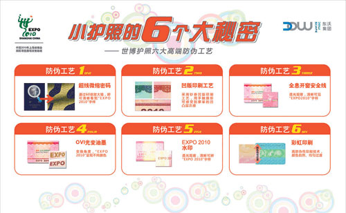 此外,記者了解到,改版后的世博護(hù)照還加強了防偽技術(shù)。據(jù)悉,改版《世博護(hù)照》各款產(chǎn)品封面的燙金世博Logo內(nèi)均采用了超線微縮密碼防偽技術(shù),采用60倍的放大鏡觀看,則可清晰看到EXPO2010字樣。這一通常只用于鈔券的高端防偽技術(shù)被運用,標(biāo)志著世博護(hù)照的防偽技術(shù)又上一個新臺階,同時也再次提升了世博護(hù)照的珍藏價值。