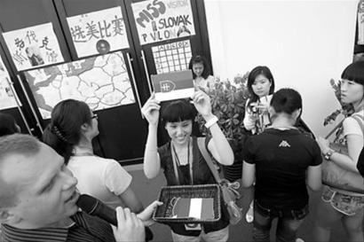 昨天下午2點(diǎn), 18名在斯洛伐克館等待入場的美女被邀請參加“女士之日”的選美大賽,比賽共分為兩個(gè)環(huán)節(jié),包括有關(guān)世博和斯洛伐克的問答,以及才藝表演。在決賽環(huán)節(jié),三位女士同時(shí)學(xué)唱一首斯洛伐克兒歌,現(xiàn)場的觀眾則成為決賽評委。最終,來自上海徐匯區(qū)的護(hù)士小姐沈瑾脫穎而出,獲得 “斯洛伐克館小姐”的榮譽(yù)稱號,她的大幅照片還將被掛在斯洛伐克館的貴賓廳。除了來自斯洛伐克館的眾多禮遇,她還能選擇多個(gè)熱門場館,直接從VIP通道入內(nèi)參觀。