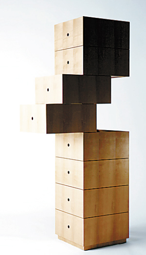 這個(gè)由女設(shè)計(jì)師Tadao Hoshino設(shè)計(jì)的“異形”抽屜組合,靈感來自于一位女性不斷膨脹的儲(chǔ)物愿望。同為女性,女設(shè)計(jì)師Hoshino比任何人都明白女士們總會(huì)不斷購買服飾而讓自己的抽屜不堪負(fù)荷。這個(gè)組合家具共有八個(gè)相同的抽屜,雖然每個(gè)抽屜的樣子并不特別,只是四方的木質(zhì)抽屜,然而每個(gè)抽屜的排列方式卻很特別,形成了一種組合的趣味。(陳薇薇、陳晶晶)