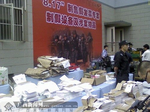 南寧市公安局11日向社會披露,7月7日,在(廣西)自治區(qū)公安廳的領(lǐng)導(dǎo)和指揮下,該局成功破獲了公安部督辦的以曾某為首的非法制造出售假發(fā)票犯罪團伙的特大案件(簡稱“8.17”專案)。搗毀大型假發(fā)票印制窩點1個、假發(fā)票藏匿窩點1個,抓獲涉案人員10人,繳獲假發(fā)票82.94萬份,累計票面金額53.3億元,涉稅金額2.46億元;印制假發(fā)票的機器設(shè)備4臺、模版、底片、印章、紙張、油墨等制假材料一批。這是目前為止廣西累計票面金額最大的假發(fā)票案。