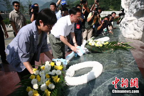中新網(wǎng)都江堰7月27日電(劉賢 張浪)27日,曾蔭權(quán)率領(lǐng)的香港特區(qū)政府代表團(tuán)抵達(dá)四川地震災(zāi)區(qū)汶川。在參觀完香港援川項目以后,曾蔭權(quán)一行隨即來到漩口中學(xué)地震遺址,向汶川大地震遇難者和在抗震救災(zāi)中英勇犧牲的烈士默哀鞠躬,獻(xiàn)花祭奠。