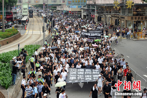 中新社香港8月29日電 (記者 曾嘉)香港29日下午舉行“沉痛哀悼遇難同胞、要求徹查事件真相”游行,游行以沉默及平和方式進行。主辦方表示,游行者達8萬人。特區(qū)行政長官曾蔭權(quán)表示,香港市民的理性游行加強了他處理菲律賓人質(zhì)劫持事件善后工作的決心。