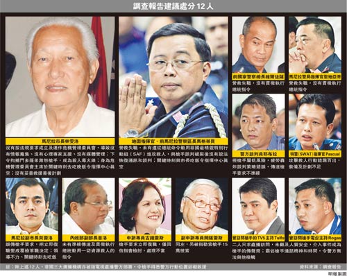 阿基諾三世昨在記者會上透露,調(diào)查報(bào)告建議他對12名官員及傳媒工作者作行政或刑事檢控,包括市長林雯洛、內(nèi)政部副部長普洛、正副申訴專員、前警察總長、談判專家、特警指揮官及當(dāng)日與門多薩做直播訪問的電臺節(jié)目主持人等。