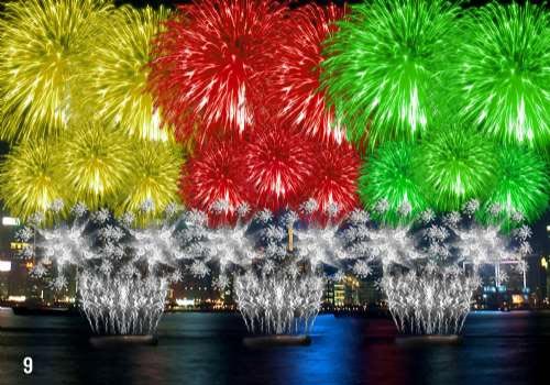 國慶煙花匯演共有九幕。第一幕“萬眾同心”,天空中將綻放出大“紅太陽”、“紅色五角星”和“紫荊花”形圖案,慶祝國慶。在第五幕,銀閃、綠閃、紅閃、金閃、橙閃等顏色的煙花,和諧悅目,展示該幕主題“大同世界”;最后一幕“國運昌隆”,絢爛而熱鬧,加上長達(dá)六十秒密集發(fā)放繽紛色彩的煙花,把整個煙花匯演推向高潮。