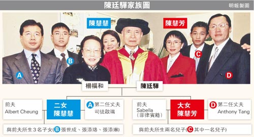 至于其妹陳慧慧,近年已出任南豐集團董事長兼董事總經(jīng)理,她與前夫所生的3名子女張世成、張?zhí)礴蠛蛷執(zhí)砹站完懤m(xù)加入南豐管理層,在陳廷驊在2008 年退休之后,其家庭勢將接掌整個南豐王國。其母楊福和日前于入稟狀就指出,陳慧慧于2003至2005年曾向父親作出虛假陳述,以致出現(xiàn)家族財產(chǎn)轉(zhuǎn)移,但當中未有透露具體與哪些財產(chǎn)有關(guān)。