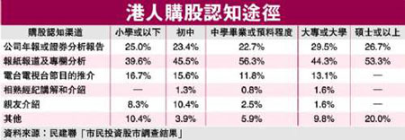 不過,即使在表示會(huì)初步了解公司資料者中,也有48.8%主要是透過“報(bào)紙報(bào)道及專欄分析”作為資料來源,13.1%則根據(jù)“電臺(tái)及電視節(jié)目推介”,只有24.7%的主要資料來源是“公司年報(bào)或證券行分析報(bào)告”。