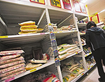 國際市場食用米供應(yīng)緊張和大幅加價,令香港部分市民出現(xiàn)恐慌心理,紛紛到超市入貨。3月31日,一些超市的貨架上,部分牌子的泰國米已經(jīng)缺貨。有市民表示,擔(dān)心米價會再上升,所以入多點(diǎn)貨,有市民甚至用小推車一次性購十幾包。不過,也有市民表示并不擔(dān)心,因?yàn)椤耙话卓梢猿院芫谩薄?